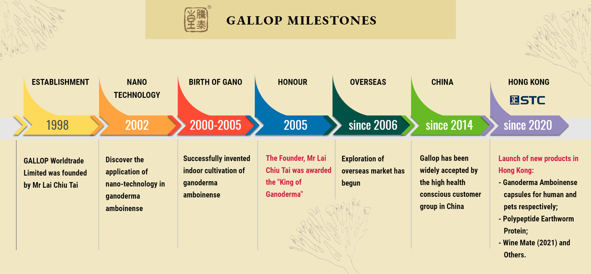 GALLOP WORLDTRADE LIMITED (abbreviated as “Gallop”) has been established since 1998 by MR LAI CHIU TAI who was honoured as “The King of Ganoderma”. Mr Lai’s concentration in the research and development of effective healthcare products with the core ingredient of Ganoderma Amboinense, has benefited all health-conscious mankind and deserved to receive such honour.